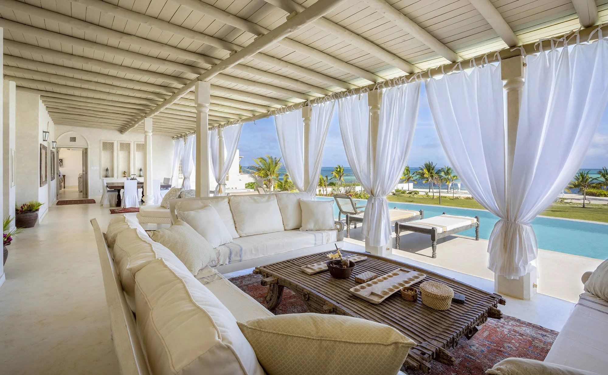 The Veranda features breath-taking Ocean view, shady sofas, plenty of stylish ornaments collected locally and breezy spaces to eat, drink, relax and socialize. A modern folding system of frameless glazing allows you to enjoy the beautiful view of the pool and the Ocean in any climatic situation.